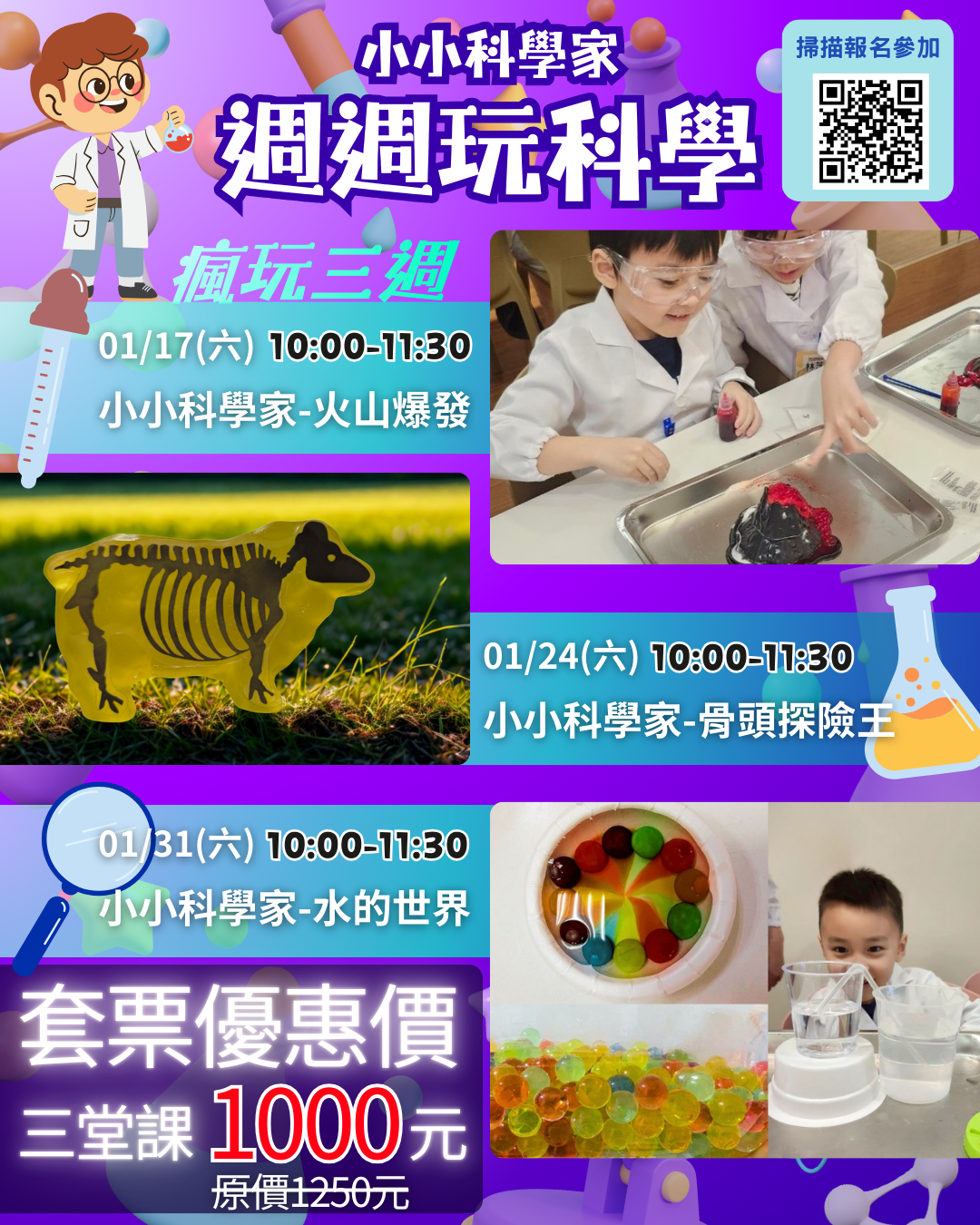 2026寒假精彩的科學冒險登場! 連續三週的科學實驗課, 帶領孩子從地底的火山噴發,一路探索到神祕的骨頭世界與奇幻的水中奧秘!